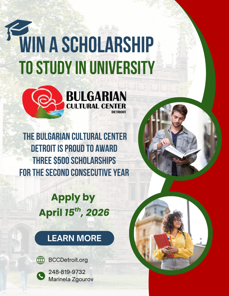 ​For the second consecutive year, the Bulgarian Cultural Center (BCC) proudly awards three $500 scholarships for the 2026–2027 academic year. Scholarships are available to graduating high school seniors and college freshmen or sophomore’s students of Bulgarian descent. The application deadline is April 15, 2026. Criteria’s that will be considered are the applicant’s prior academic performance as well as demonstration of community involvement.